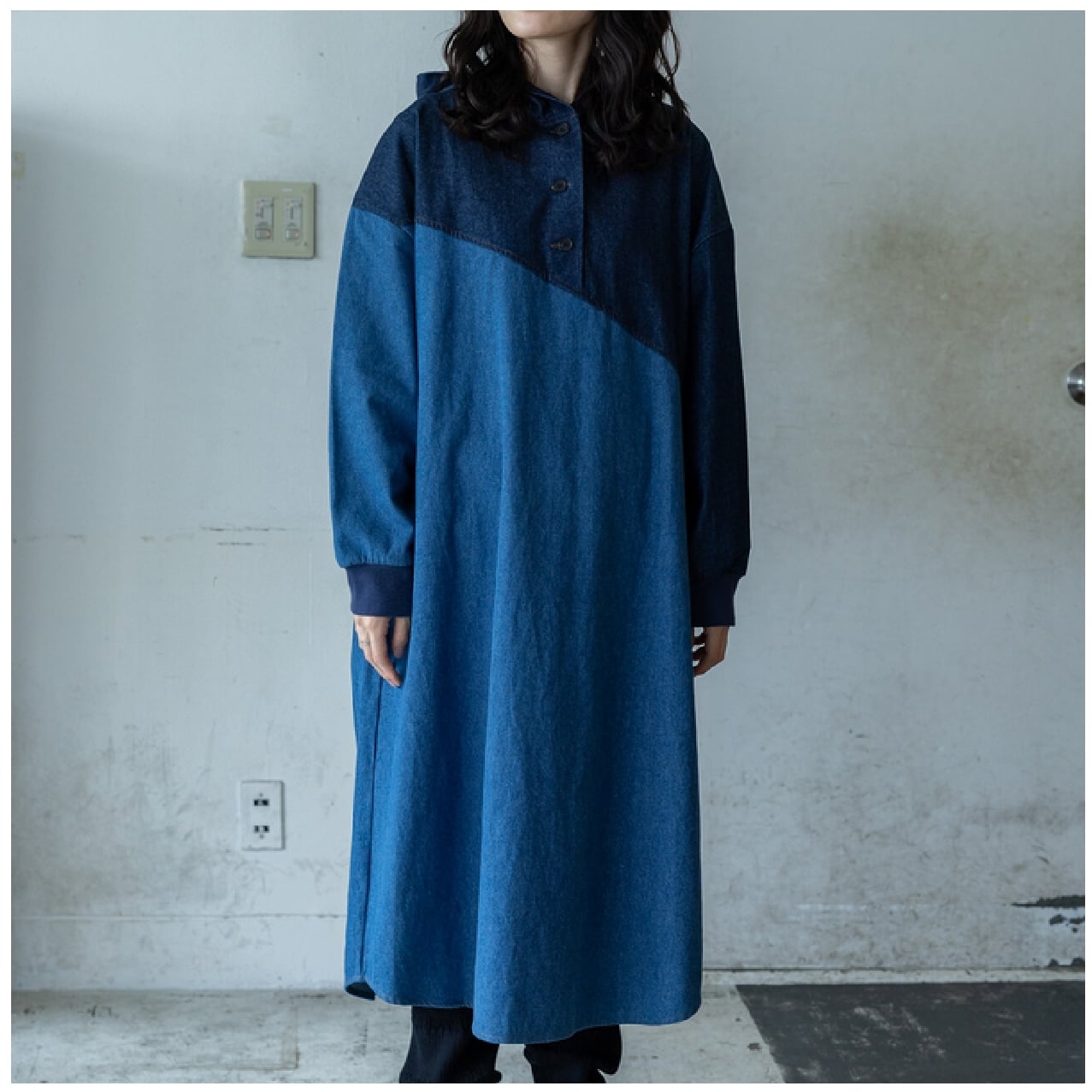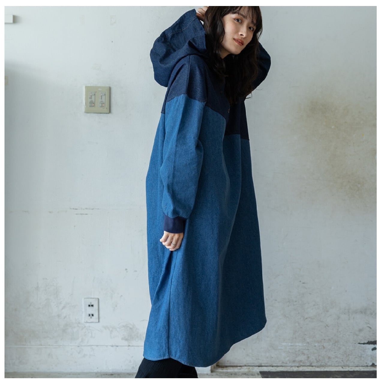 デニムバイカラー使いでモードな雰囲気のフード付きワンピース。