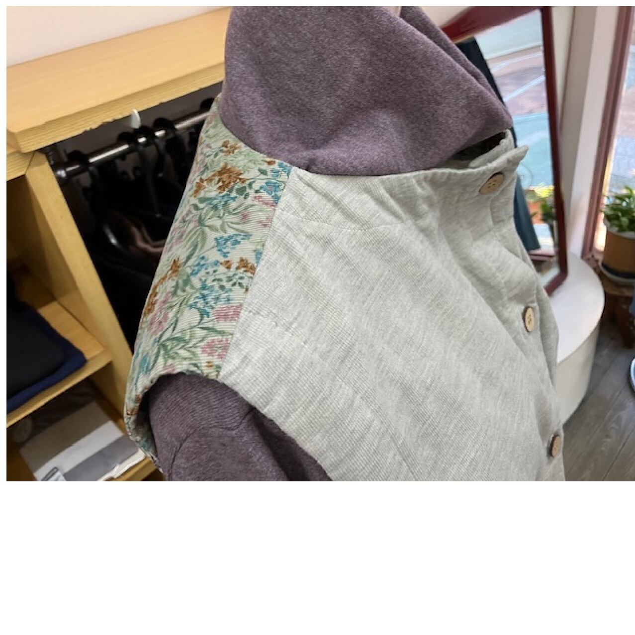 小花プリントのパッチで個性が引き立つベスト・・・ ■カラー GJ ■素材 綿100% ■サイズ M:着丈61cm、脇下身幅52cm ■税込価格 17,380円