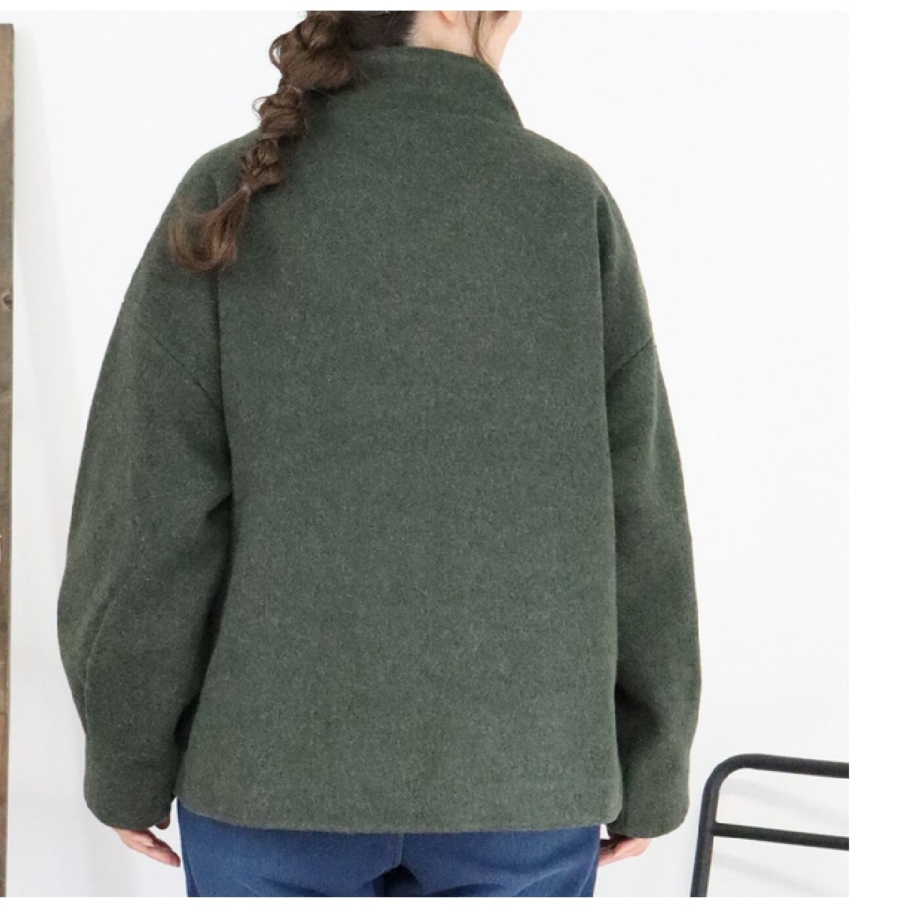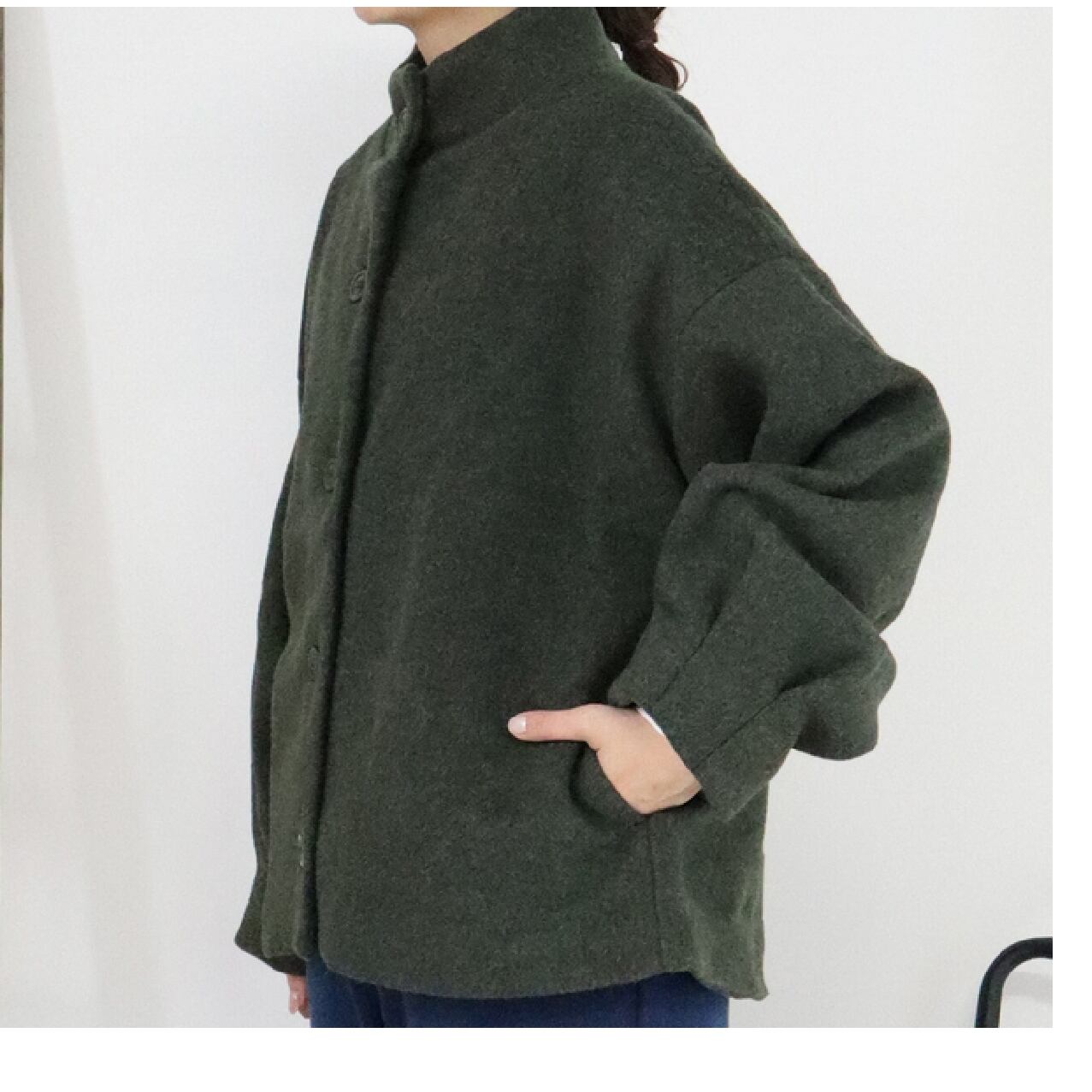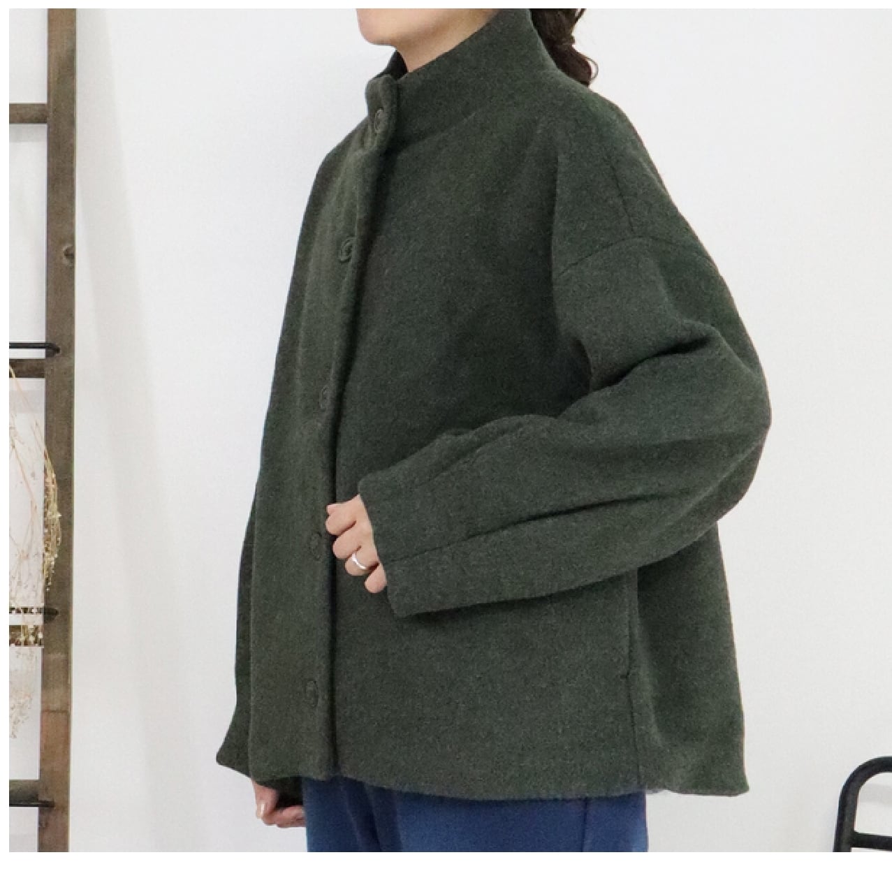 Aラインシルエットに、首元まで暖かい大きめのスタンドカラーが特徴のショート丈コート。