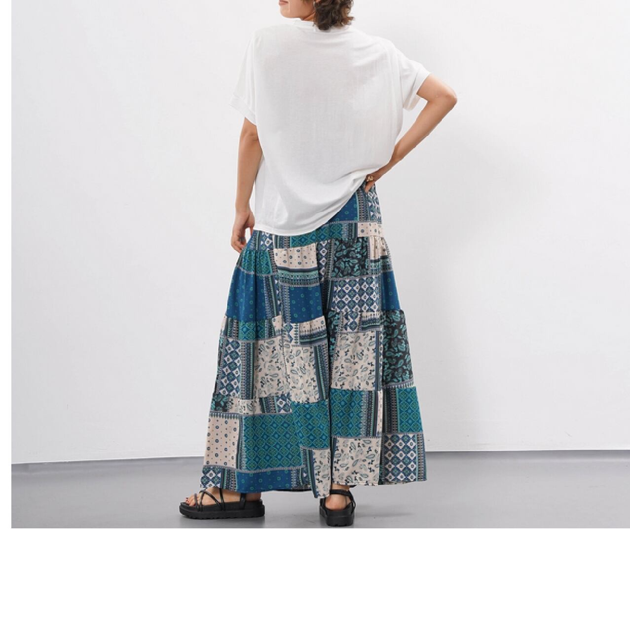 パッチワーク風プリントティアードスカート/ブルー/M-L